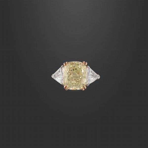 in oro bianco e giallo con diamante taglio a cuscino del peso di 10,13 ct, affiancato da due diamanti triangolari del peso complessivo di 2,19 ct, gr. 9.