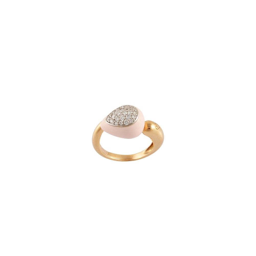 contrarié in oro rosa e bianco con goccia in smalto rosa ornata da pavé di brillanti, gr. 9.