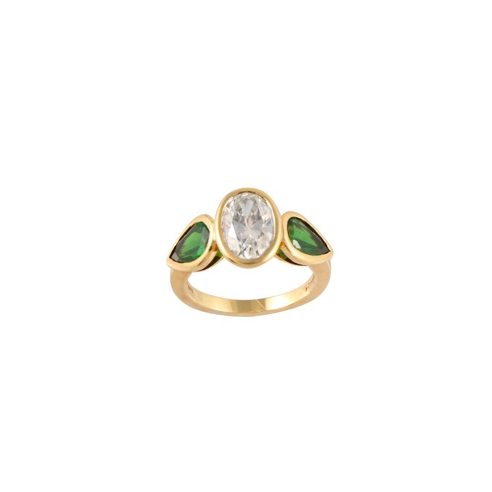 in oro giallo con diamante ovale al centro del peso di 1,50 ct ca., affiancato da due smeraldi a goccia, gr. 5,9.Misura 13