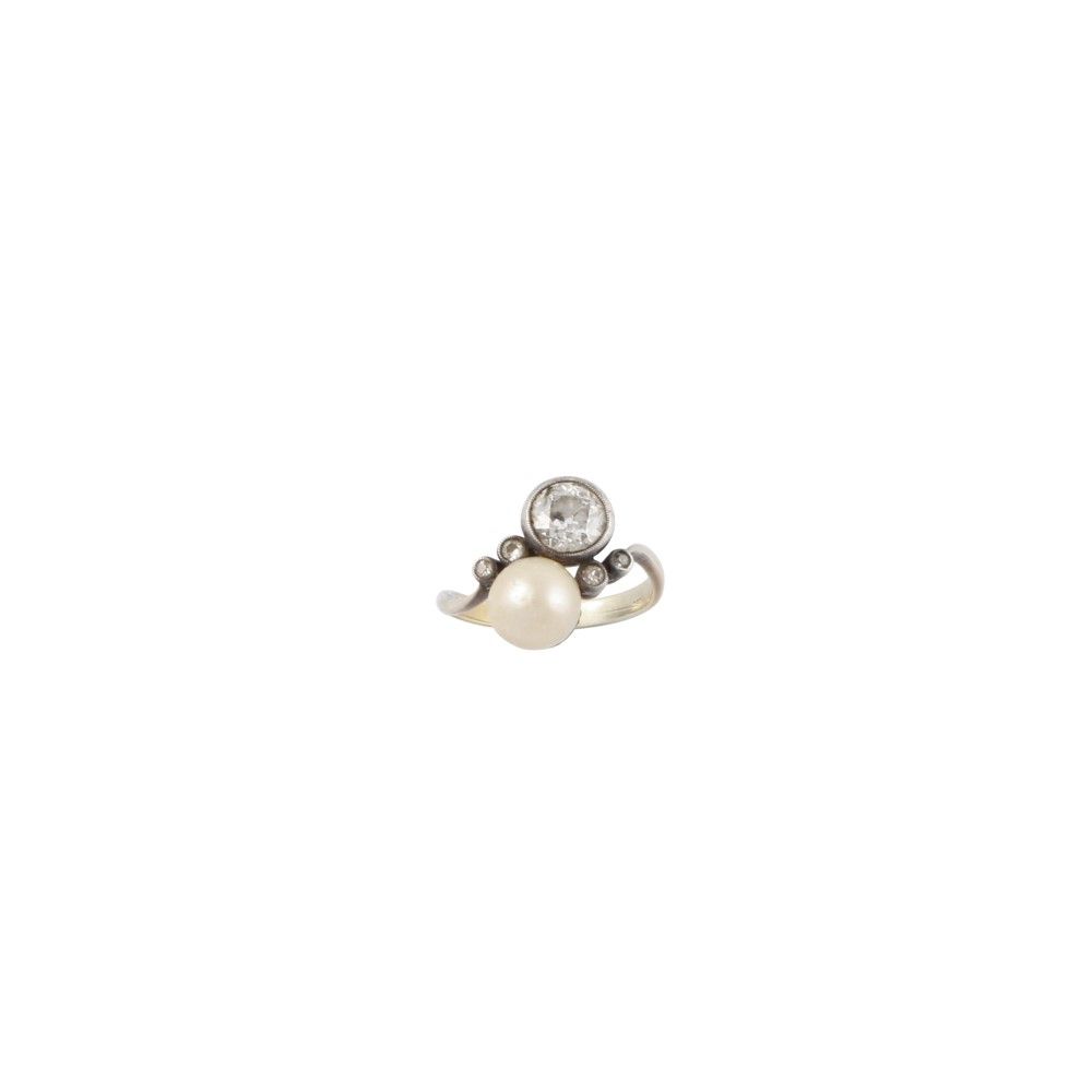 contrarié in oro giallo e argento con perla naturale d'acqua salata 7,51/7,60 x 6,20 mm e diamante del peso di 0,85 ct ca., gr. 3,4.