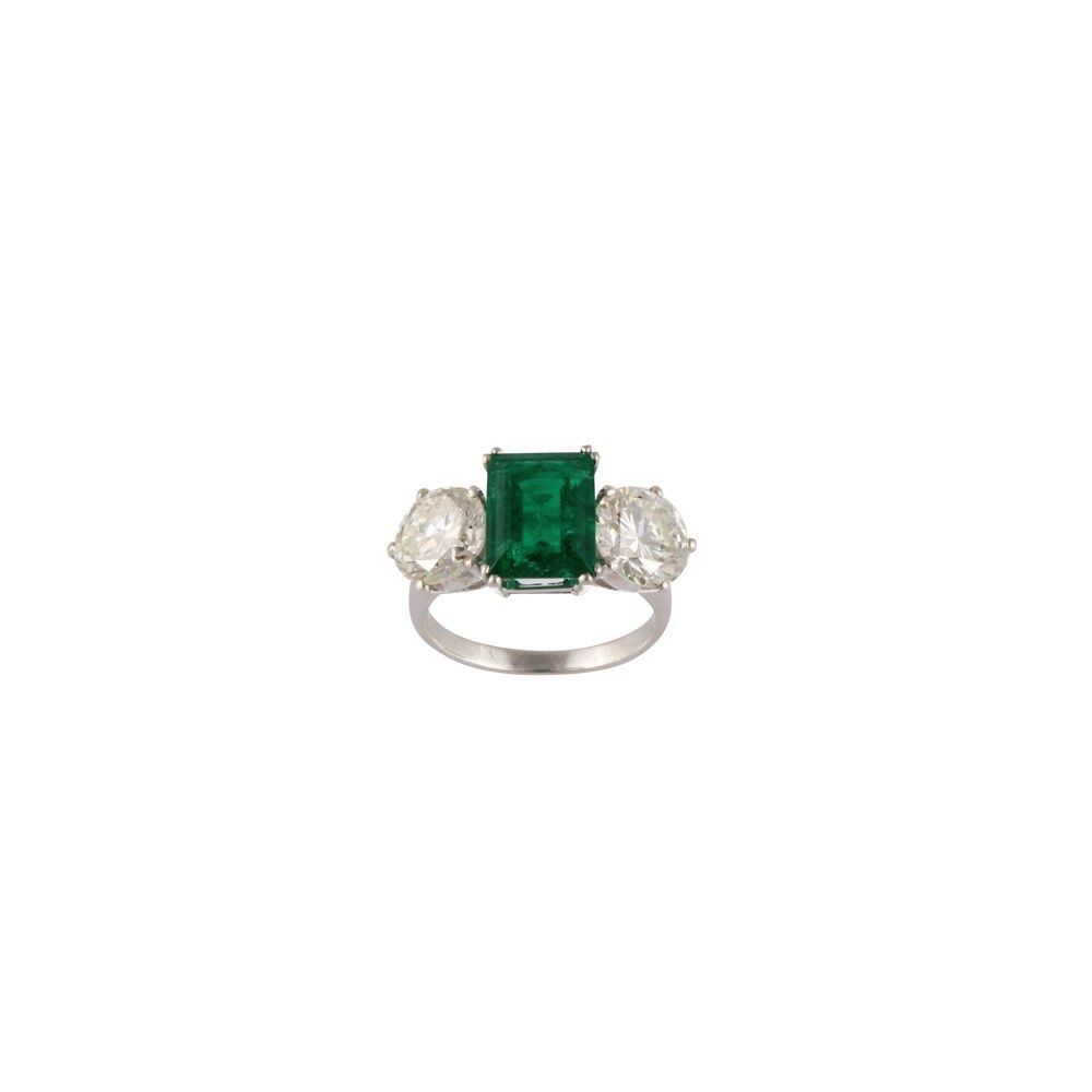 in oro bianco con smeraldo rettangolare del peso di 2,80 ct ca., affiancato da due brillanti del peso complessivo di 3,20 ct ca., gr. 5,1.