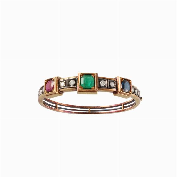 rigido in oro e argento con zaffiro del peso di 1,80 ct ca., smeraldo del peso di 2,50 ct ca. e rubino del peso di 2,30 ct ca. posti in linea, intervallati da brillanti del peso complessivo di 1,20 ct ca., gr. 40,8.Misura 18,5 cm ca.