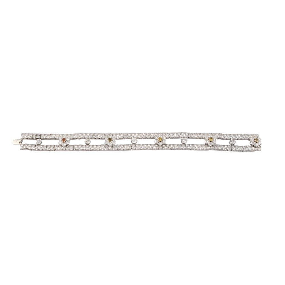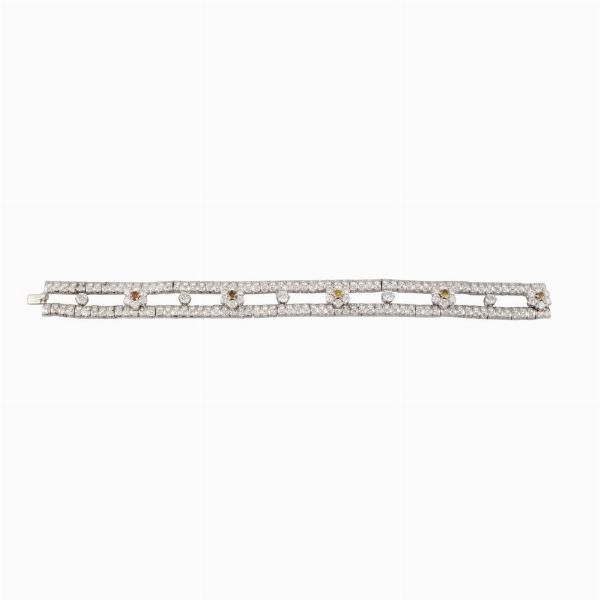 in oro bianco costituito da due rivière percorse da brillanti e distanziate da cinque fiori stilizzati in brillanti incolore e colore fantasia, gr. 57,6. Brillanti del peso complessivo di 11 ct ca.