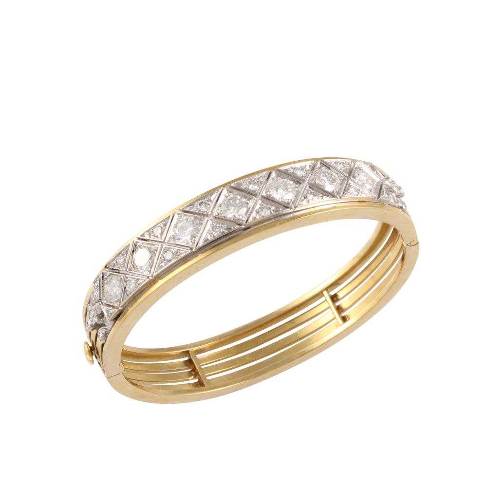rigido in oro giallo e bianco ornato anteriormente da un motivo geometrico in brillanti del peso complessivo di 1,75 ct ca., gr. 40,6.