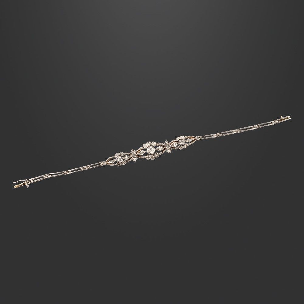 in platino e oro a maglie rettangolari evidenziato al centro da tre motivi geometrici traforati ornati da diamanti, gr. 9,9.