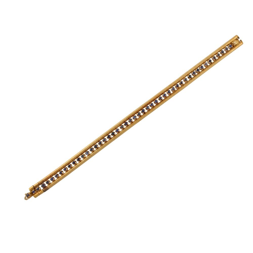 a doppio nastro tubolare in oro giallo a lavorazione puntinata, percorso al centro da zaffiri tondi, gr. 33,6.