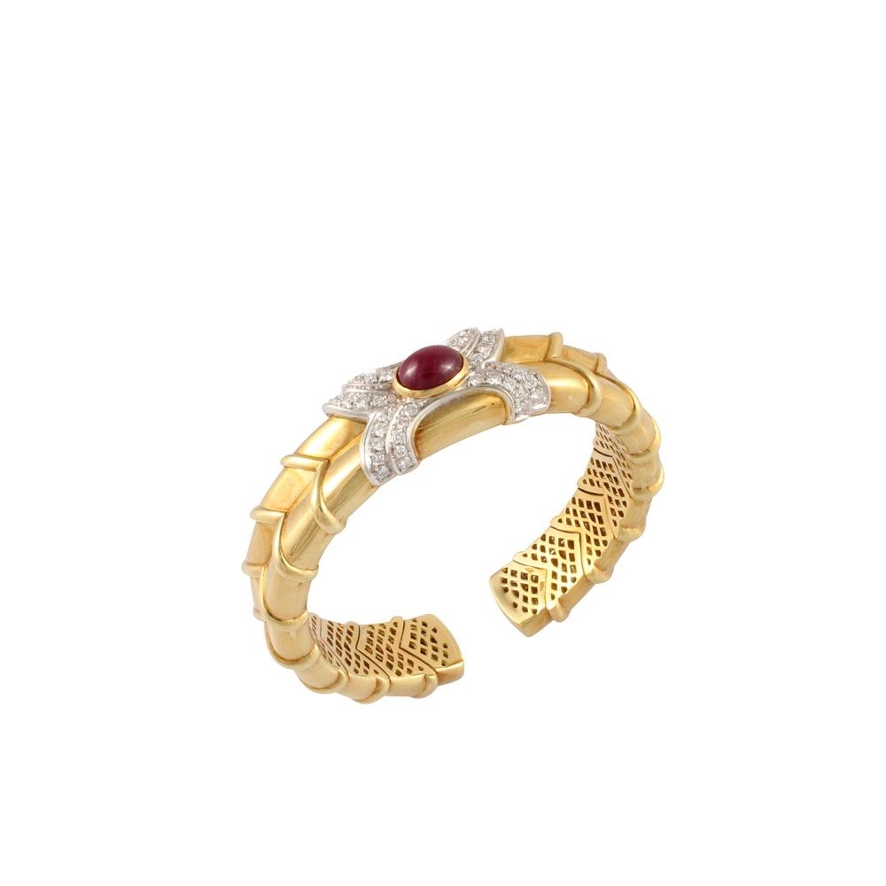 semirigido in oro giallo percorso da motivi a punta di freccia con decoro superiore in oro bianco e brillanti del peso complessivo di 1,20 ct ca. centrato da un rubino ovale cabochon, gr. 85.