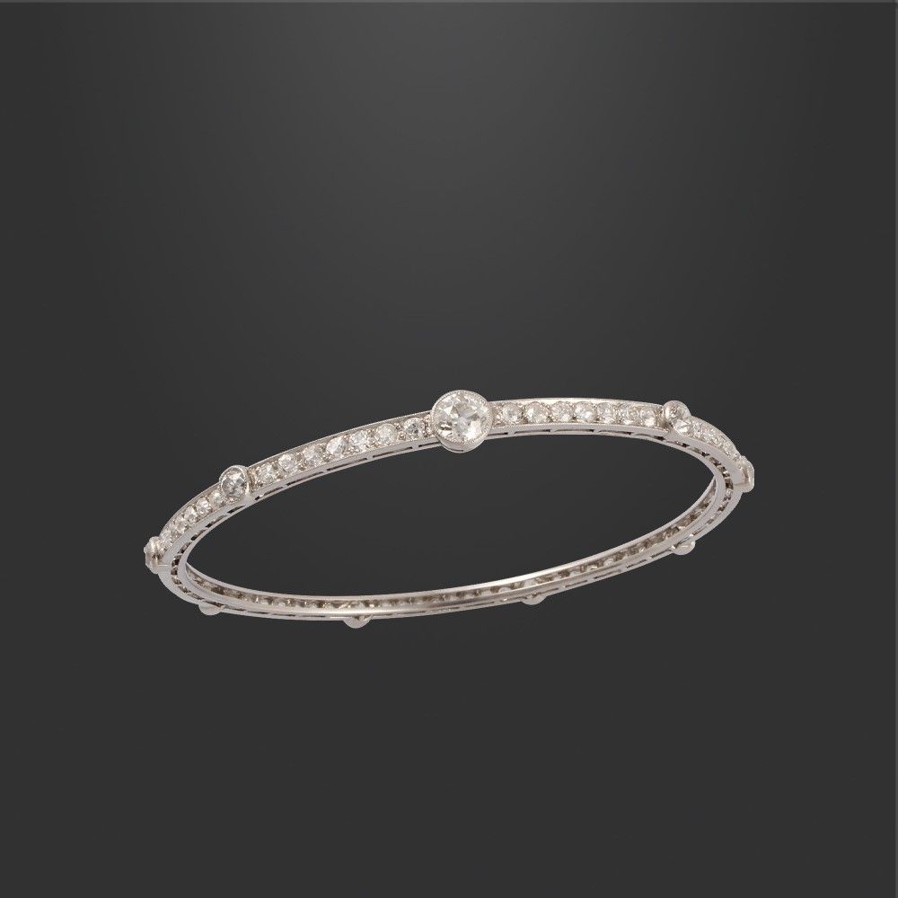 a cerchio rigido in platino interamente precorso da brillanti del peso complessivo di 5 ct ca., gr. 15,8.