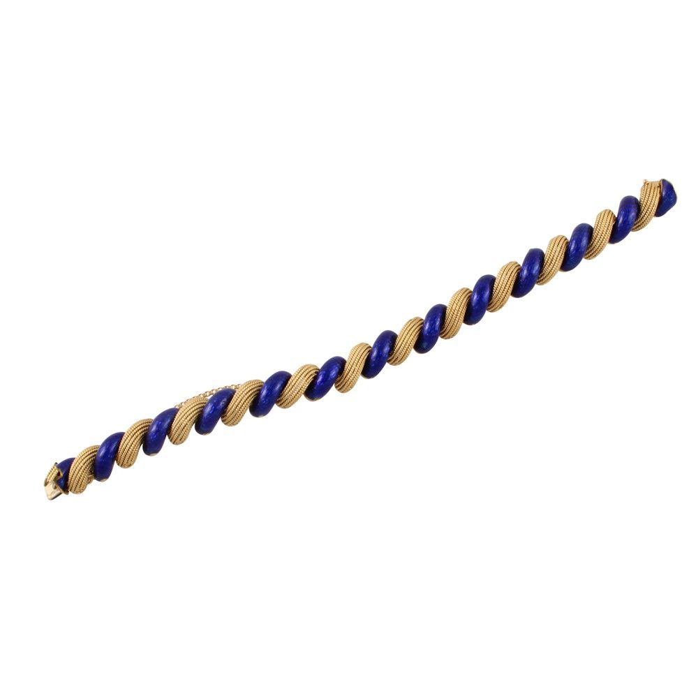 a nastro ritorto in oro giallo lavorato a cordoncino e smalto blu (lievi mancanze), gr. 58,7.