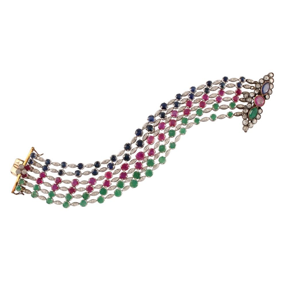costituito da sei rivière in oro bianco con smeraldi, rubini e zaffiri alternati a diamanti con chiusura a losanga in argento e oro ornata da brillanti, rubino tondo, zaffiro e smeraldo navette, gr. 84,3.
