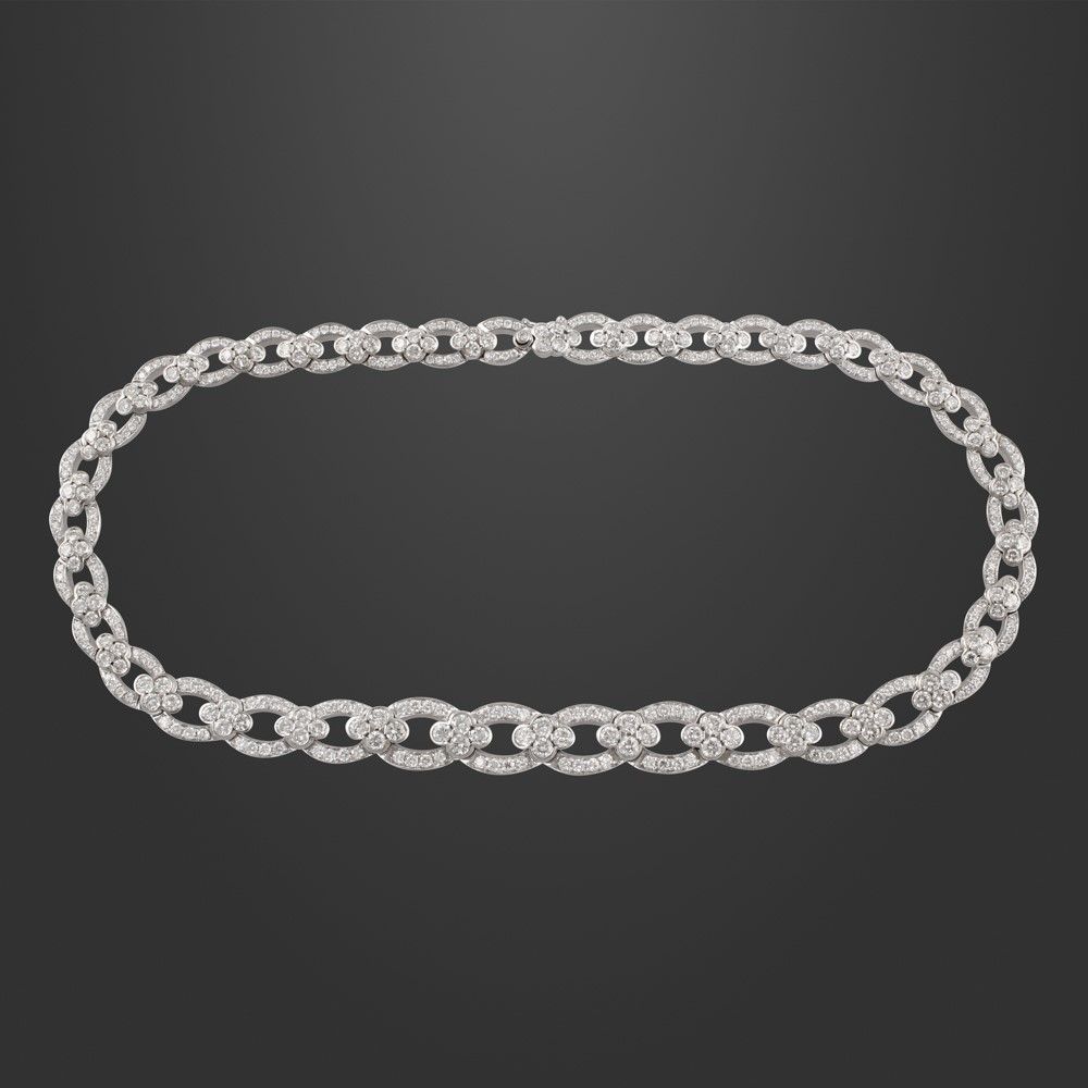 girocollo in oro rodiato con brillanti del peso complessivo di 16 ct ca., costituita da elementi ovali aperti alternati a fiori quadripetali stilizzati posti in gradazione, gr. 79,6.