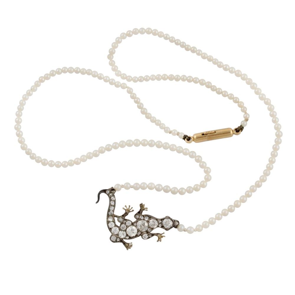 ad un filo di piccole perle raccordate da un motivo centrale raffigurante una lucertola in argento e oro con diamanti, chiusura in oro giallo, gr. 5,3.