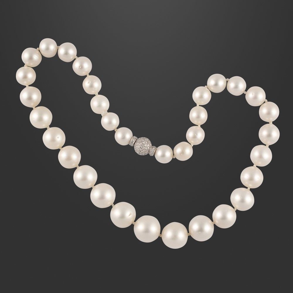 ad un filo di perle South Sea poste in gradazione 14,6 / 10 mm, chiusura sferica in oro bianco tempestata di brillanti.