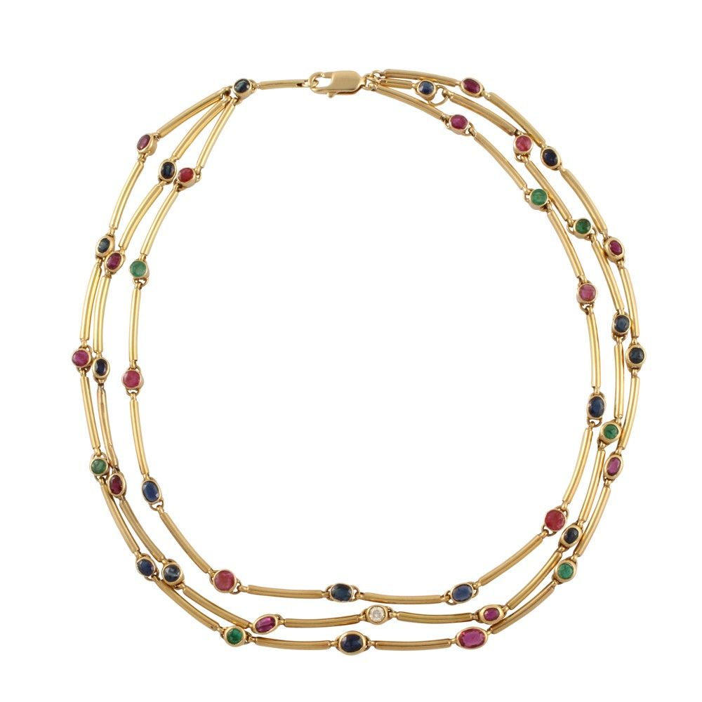 a tre file di segmenti snodati in oro giallo intervallati da rubini, zaffiri, smeraldi e brillante, gr. 69,8.