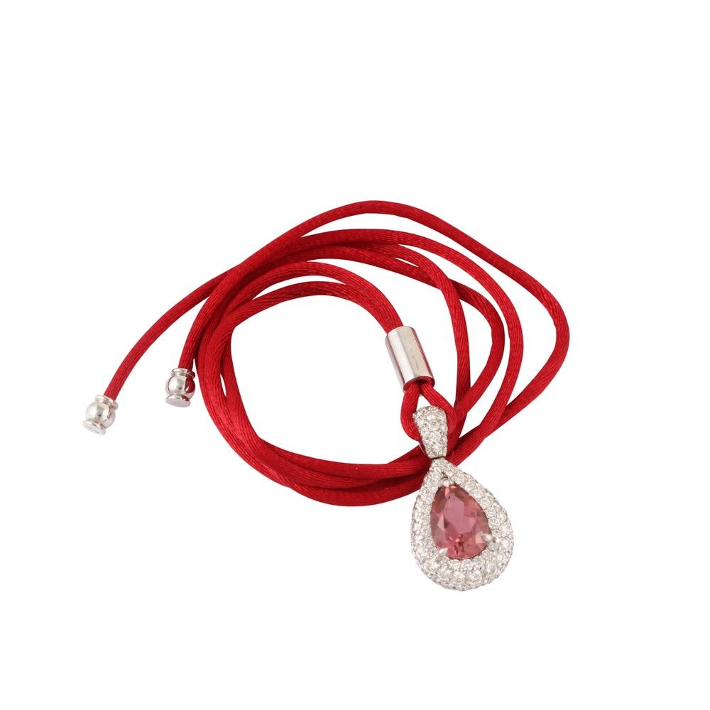 con pendente in oro bianco a forma di goccia in pavé di brillanti con al centro una tormalina rosa del peso di 3,50 ct ca., sorretto da un cordoncino in seta bordeaux con chiusura saliscendi in oro, gr. 13,1.