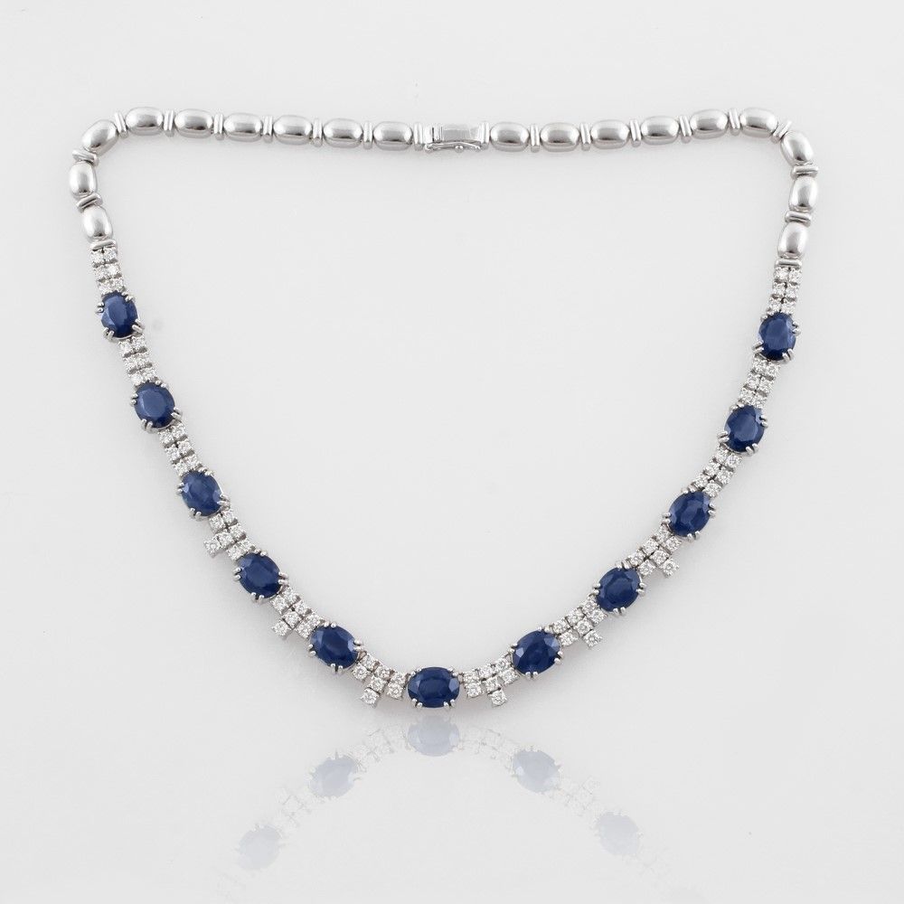 in oro bianco evidenziata anteriormente da undici zaffiri ovali del peso complessivo di 25 ct ca., alternati a brillanti del peso complessivo di 3,60 ct ca., gr. 54,6.