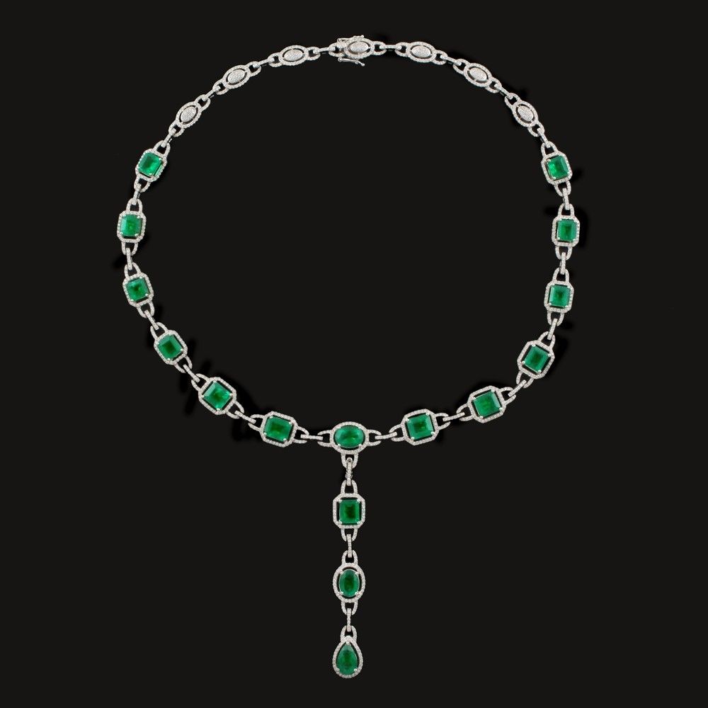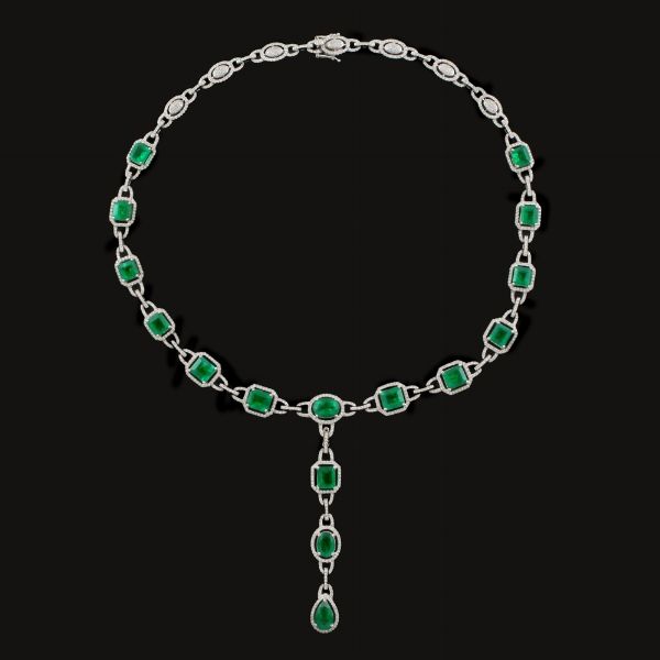 in oro bianco e diamanti ornata anteriormente da smeraldi ed evidenziata al centro da un pendente staccabile, gr. 53,8. Smeraldi del peso complessivo di 20 ct ca., brillanti del peso complessivo di 5 ct ca., gr. 53,8.
