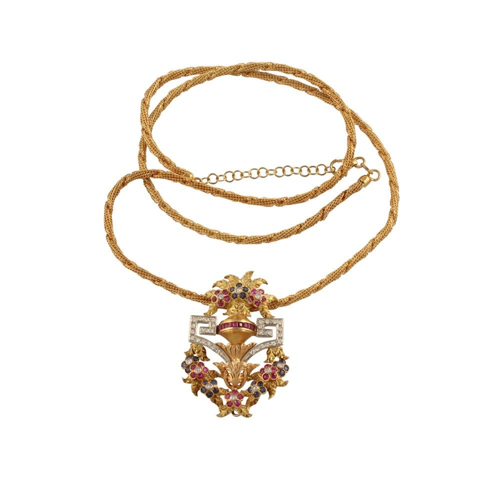 in oro giallo e bianco con pendente raffigurante un vaso fiorito ornato da piccoli rubini, zaffiri e diamanti, gr. 29,5.