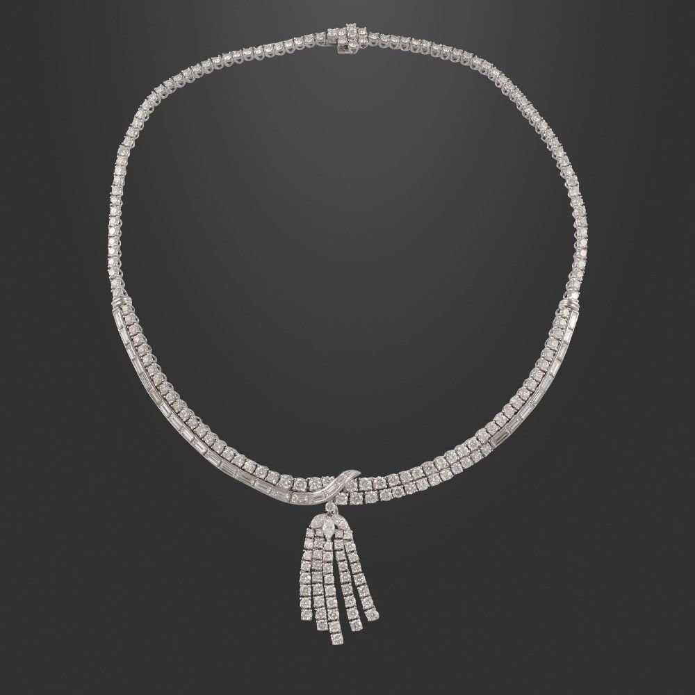 rivière in oro rodiato con brillanti e diamanti baguettes a sostegno di un pendente staccabile a morbida frangia con brillanti e diamanti navettes, gr. 48,7. Diamanti del peso complessivo di 19,87 ct ca.