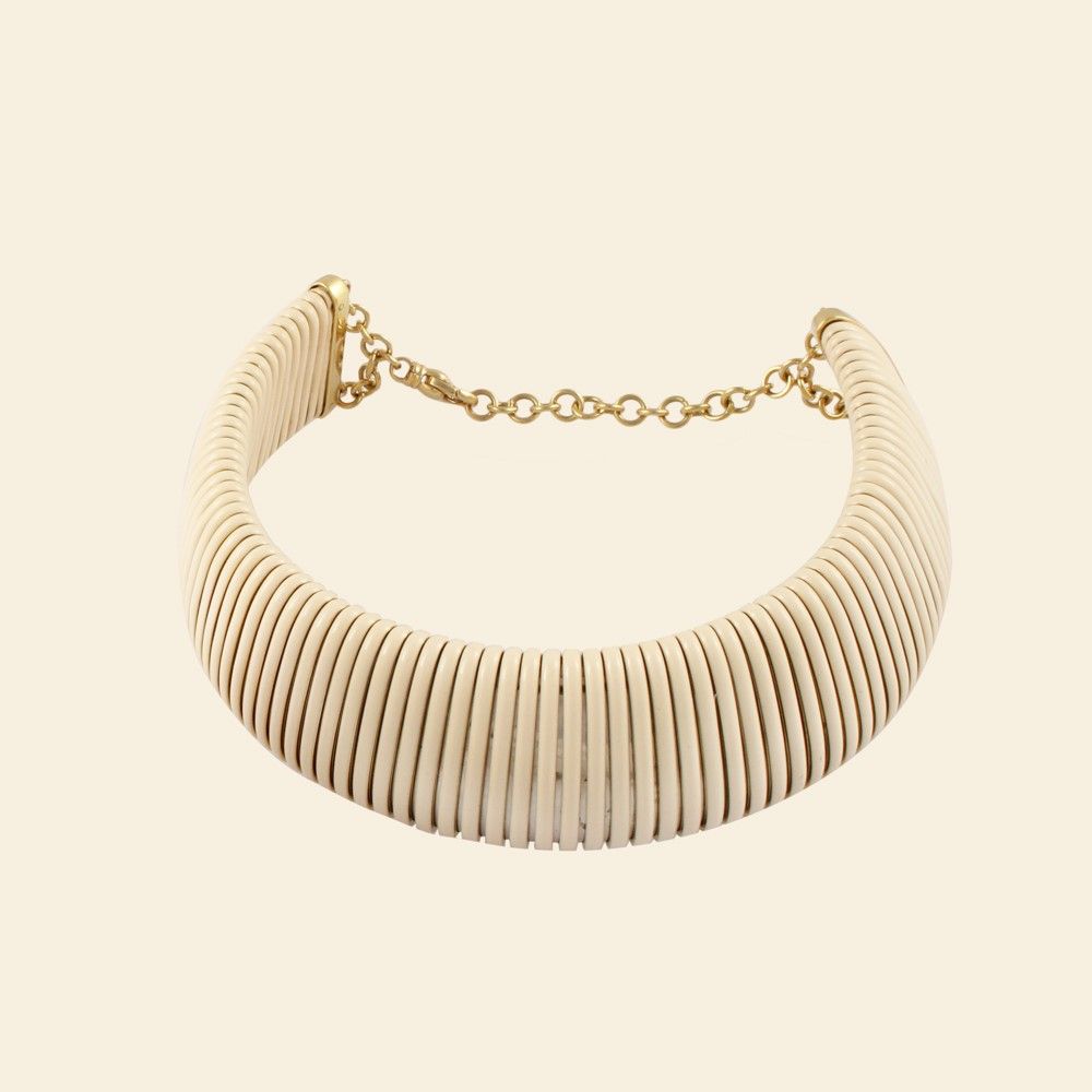 in oro giallo, bianco e smalto color crème, chiusura con catena e moschettone, gr. 192,6.