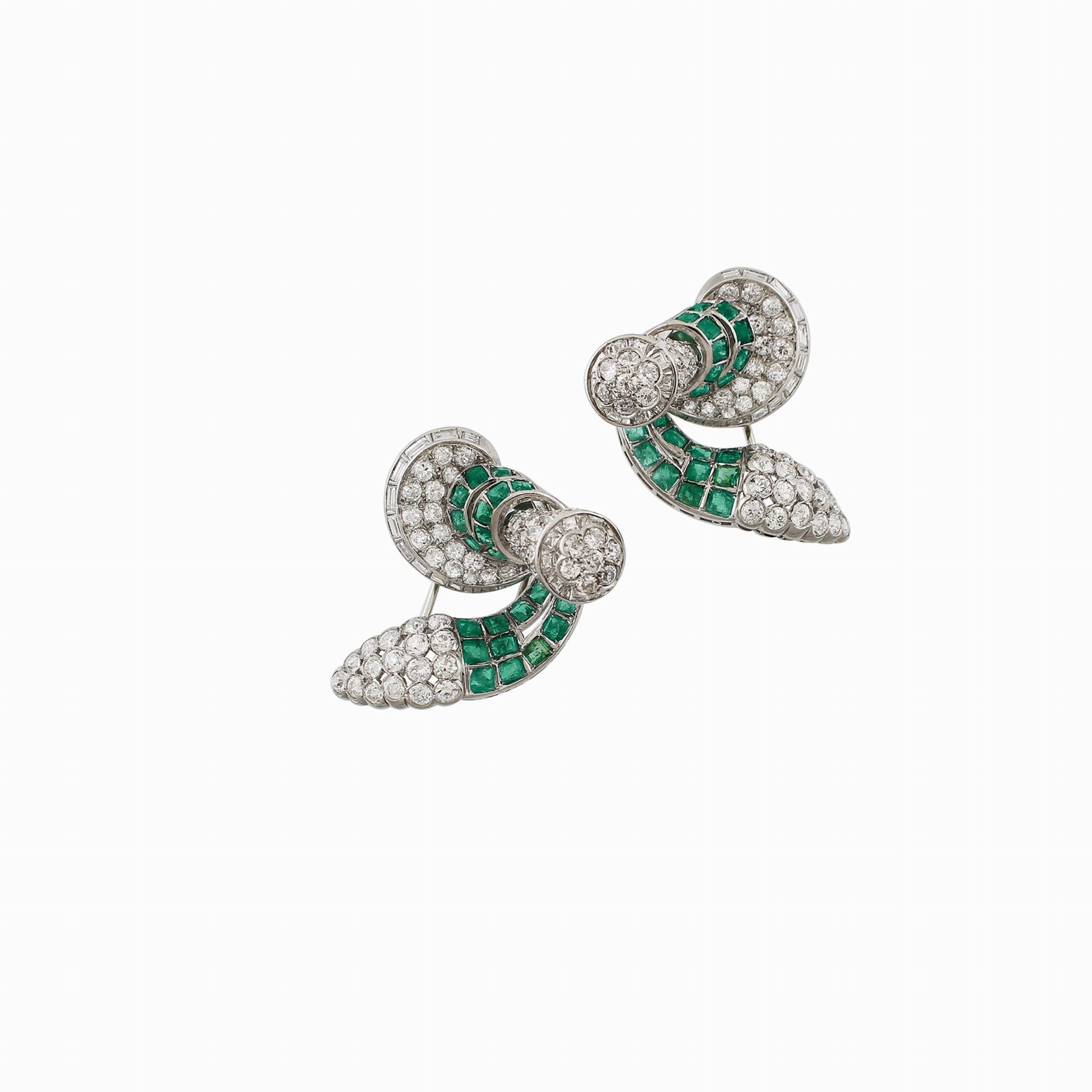 a clip in platino a volute contrapposte con pavé di brillanti, diamanti carré, baguettes e smeraldi, gr. complessivi 34.