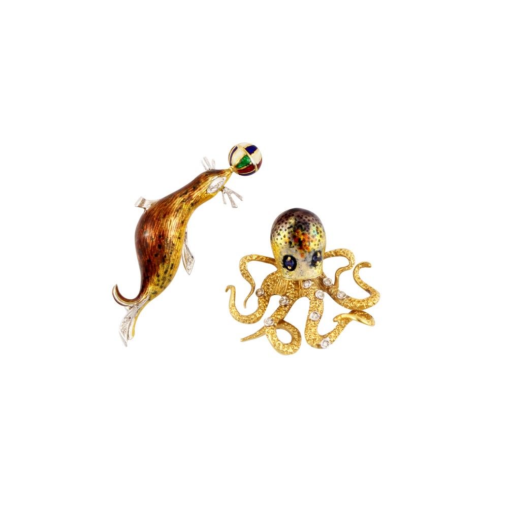 in oro giallo e bianco con smalti policromi e piccoli diamanti rispettivamente raffiguranti una foca con palla e un polpo con occhi in zaffiri, gr. complessivi 23,3.