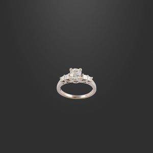 in oro bianco con brillante centrale del peso di 0,75 ct ca. affiancato da diamanti princess, gr. 3,7. Misura [..]