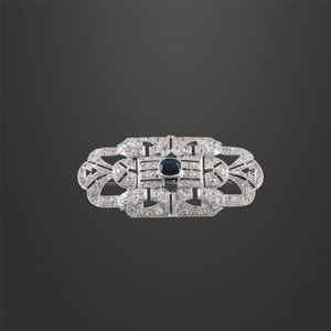 in platino finemente traforata con diamanti e zaffiro ovale posto al centro (spillone amovibile per eventuale [..]