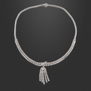 rivière in oro rodiato con brillanti e diamanti baguettes a sostegno di un pendente staccabile a morbida frangia [..]