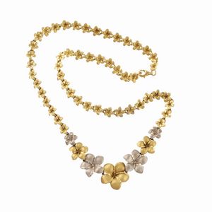 in oro bianco e giallo interamente percorso da fiori tiarè posti in gradazione realizzati , gr. 26,2. Lunghezza [..]
