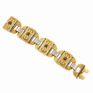 in oro giallo e bianco costituito da cinque placche finemente cesellate ornate da zaffiri e smalto blu (lievi [..]