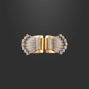 in oro giallo e platino a forma rettangolare con motivi contrapposti a ventaglio in brillanti e diamanti baguettes [..]