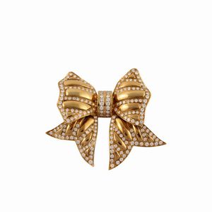 a fiocco in oro giallo ornata da brillanti del peso complessivo di 5 ct ca., gr. 43,9. Dimensioni 6x7 cm ca. [..]