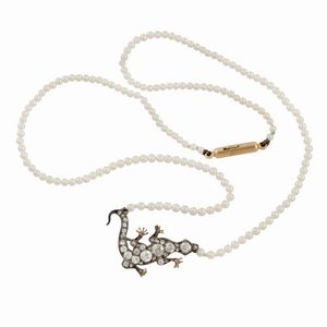 ad un filo di piccole perle raccordate da un motivo centrale raffigurante una lucertola in argento e oro con diamanti, [..]
