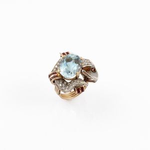 in oro a titolo basso con acquamarina ovale del peso di 12 ct ca., posta al centro di un motivo sinuoso in brillanti [..]