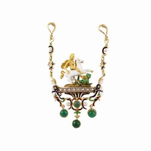 in oro giallo con agata, rubini, zaffiri, perle e smalti, gr. 12,2. Firmati: Percossi Papi