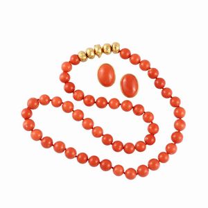 di orecchini e spilla-pendente doppio uso a guisa di grappolo d'uva fogliato con coralli, montature in oro a [..]