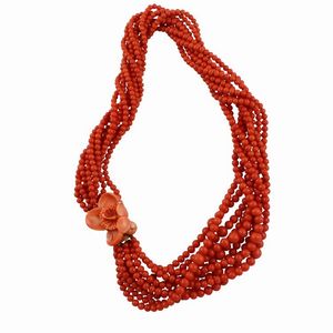 a nove fili di sfere di corallo poste a scalare 8,5 / 4 mm, chiusura laterale con fiore in corallo inciso, montatura [..]