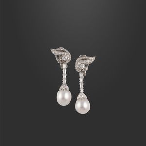 pendenti in oro bianco, ciascuno con brillanti e diamanti baguettes del peso complessivo di 1,20 ct ca. e perla [..]