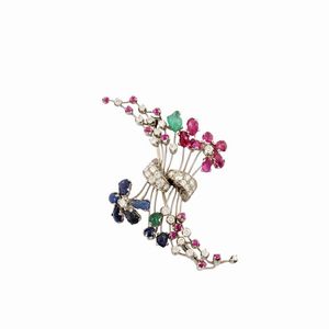 in platino a tralcio fiorito con rubini, zaffiri, smeraldi e brillanti, gr. 18,8. Dimensioni 7 x 4,5 cm ca. [..]