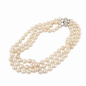 a tre fili di perle 9,5 / 9 mm, chiusura in oro bianco con pavé di brillanti del peso complessivo di 1,75 ct [..]