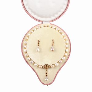 in oro giallo con perle d'acqua dolce, brillanti e tormalina en suite con il lotto precedente. Corredata da custodia. [..]
