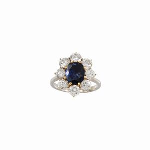 in oro bianco e giallo con zaffiro ovale posto al centro del peso di 1,40 ct ca. contornato da brillanti del [..]