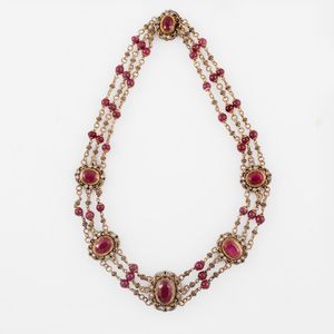 girocollo a ghirlanda in oro giallo e argento a tre fili di maglie concatenate con sfere di rubini, evidenziato [..]