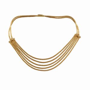 girocollo in oro giallo a più fili di maglie satinate con piccoli fiori disposti lateralmente, gr. 41. Lunghezza [..]