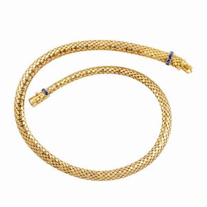in oro giallo tubolare lavorato a scaglie ornato da zaffiri, gr. 37,4. Lunghezza 43 cm Anni '50