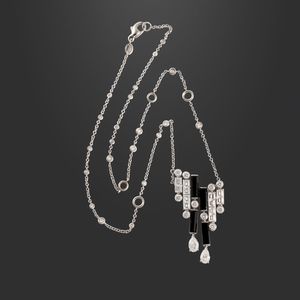 in oro bianco con motivo geometrico centrale ornato da onici, brillanti, diamanti baguettes e a goccia, sorretto [..]