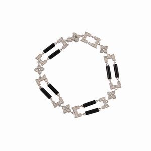 in oro bianco formato da elementi geometrici con brillanti del peso complessivo di 1,80 ct ca. e onici, gr. 11,9. [..]