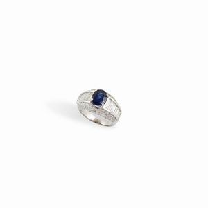 in oro bianco a fascia con zaffiro ovale centrale del peso di 1,70 ct ca., diamanti baguettes laterali del peso [..]