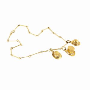 girocollo in oro giallo e bianco a segmenti snodati, al centro tre pendenti a guisa di cappelli ornati da piccoli [..]